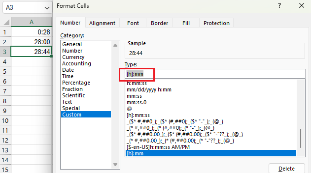 In Excel 28:44 means 28 hours 44 minutes. If you want to enter 28 minutes 44 seconds, you have to enter like 00:28:44. If you want to enter 28 hour then format the cell as
