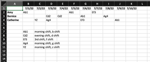 I'd like to be able to do analysis on our work schedule to assess for fairness of distribution of shifts, so I'd like help in developing formulas to achieve an example output table. Please see ...