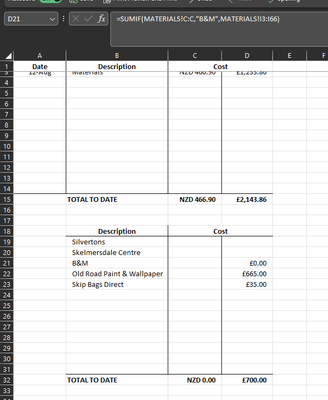 .... The formula for B&M should report back a value, however, all I get back is a '0'. The SUMIF is as 'Old Road*' and Skip Bags*'. The only difference that I can see is that there are more than is more than one entry in the B&M invoice! ... Help please?