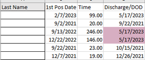 Hello! I needed assitance with plotting a person (column a) over a course of time based on 1 st positive date (column b) and discharge date (column d). I have added an extra row that calculates the ...