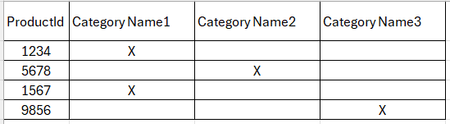 I have this - Sheet2: The 'X' marks indicate which category the product belongs to (either Category name1, Category Name2, or Category Name3). Sheet1: In Column B, I want to calculate and pop...