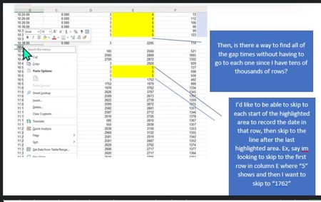 I used the conditional formatting and entered the formula =E33:E22354<10, and included the blanks or GAPS as we like to call them. These were highlighted yellow. When I entered the FILTER formula, it worked, but wasn't correct. I tried adjusting it to work, but I couldn't figure it out. I attached a file I'm working on and made changes. The date and time of when it starts (which is the first highlighted data value) is recorded along with the date and time of when it ends, which is right after the last value. This gets confusing because a GAP (blanks) are also recorded, but count as a separate time. For example, in the Info tab attached in the Excel document, the start date and time should be