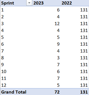 Hi,   I was merging two tables one from 2022 data and another one is current year;  where we have work done on each sprint.  one column is giving as respective numbers of each sprint and another co...