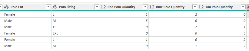 I manage uniforms for my team. I am making a SharePoint list and form that an employee will use to request the uniforms. Then, to give me a digestible table that shows me exactly what I need, I have an Excel Power Query pulling the list in. On the form, instead of having a different entry for each polo in each color, each size, and each cut, I have it separated so that you pick cut, sizing, and color separately.