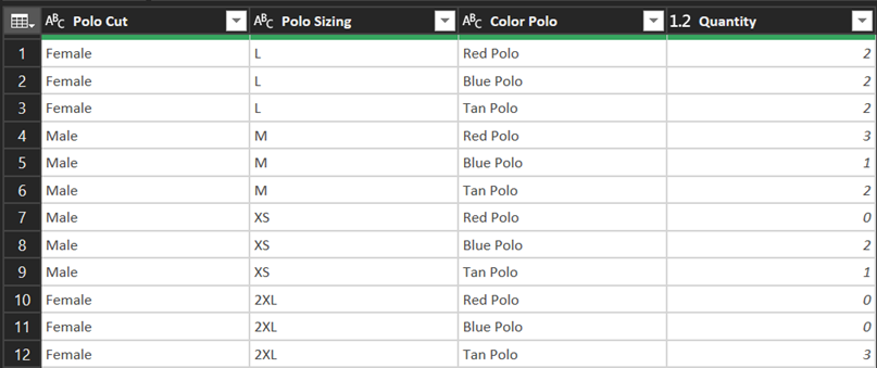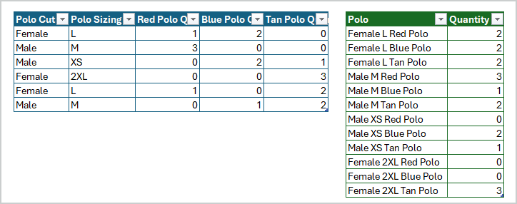 Variant is derived from SummarizedQty - output is as Sergei// CurrentTable let Source = Excel.CurrentWorkbook(){[Name="CurrentTable"]}[Content], ChangedTypes = Table.TransformColumnTypes( Source, { {"Polo Cut", type text}, {"Polo Sizing", type text}, {"Red Polo Quantity", Int64.Type}, {"Blue Polo Quantity", Int64.Type}, {"Tan Polo Quantity", Int64.Type} } ) in ChangedTypes // SummarizedQty let Source = CurrentTable, #"Unpivoted Other Columns" = Table.UnpivotOtherColumns( Source, {"Polo Cut", "Polo Sizing"}, "Attribute", "Value" ), #"Grouped Rows" = Table.Group( #"Unpivoted Other Columns", {"Polo Cut", "Polo Sizing", "Attribute"}, { {"Quantity", each List.Sum([Value]), type number} } ), #"Replaced Value" = Table.ReplaceValue( #"Grouped Rows"," Quantity", "", Replacer.ReplaceText, {"Attribute"} ), #"Renamed Columns" = Table.RenameColumns( #"Replaced Value", { {"Attribute", "Color Polo"} } ) in #"Renamed Columns"// Variant let Source = CurrentTable, #"Unpivoted Other Columns" = Table.UnpivotOtherColumns( Source, {"Polo Cut", "Polo Sizing"}, "Attribute", "Value" ), #"Grouped Rows" = Table.Group( #"Unpivoted Other Columns", {"Polo Cut", "Polo Sizing", "Attribute"}, { {"Quantity", each List.Sum([Value]), type number} } ), #"Replaced Value" = Table.ReplaceValue( #"Grouped Rows"," Quantity", "", Replacer.ReplaceText, {"Attribute"} ), #"Renamed Columns" = Table.RenameColumns( #"Replaced Value", { {"Attribute", "Color Polo"} } ), #"Inserted Merged Column" = Table.AddColumn( #"Renamed Columns", "Polo", each Text.Combine({[Polo Cut], [Polo Sizing], [Color Polo]}, " "), type text ), #"Removed Other Columns" = Table.SelectColumns( #"Inserted Merged Column", {"Quantity", "Polo"} ), #"Reordered Columns" = Table.ReorderColumns( #"Removed Other Columns", {"Polo", "Quantity"} ) in #"Reordered Columns" - SergeiBaklanDiamond Contributor