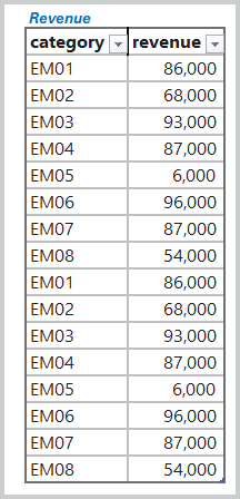 I have loaded multiple tables in power query table of revenue per category: category revenue EM01 86.000 EM02 68.000 EM03 ...