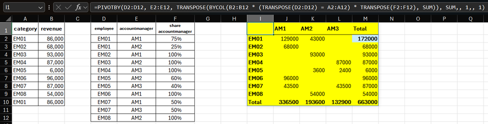 Shared := VAR TotalRevenue = SUMMARIZE ( Revenue, Revenue[category], "Revenue", SUM ( Revenue[revenue] ) ) VAR AddShares = ADDCOLUMNS ( CROSSJOIN ( TotalRevenue, Shares ), "ToTake", Revenue[category] = Shares[employee] ) VAR Filtered = FILTER ( AddShares, [ToTake] ) VAR KeepColumns = SELECTCOLUMNS ( Filtered, "Employee", [employee], "Manager", [accountmanager], "Revenue", [revenue], "Share, %", [share accountmanager] ) VAR Result = ADDCOLUMNS ( KeepColumns, "Shared", [Revenue] * [Share, %] ) RETURN SUMX ( Result, [Shared] )For Power Query only no changes are required
