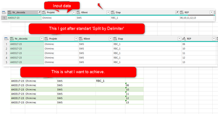 let Source = Excel.CurrentWorkbook(){[Name="Table"]}[Content], NullREP = Table.ReplaceValue(Source, each [REP], null, (x,y,z) as list => {null} & Text.Split(y, ";"), {"REP"} ), ExpandedRep = Table.ExpandListColumn(NullREP, "REP"), UpdatedEtap = Table.ReplaceValue(ExpandedRep, each [Etap], each [REP], (x,y,z) as nullable text => if z is null then y else null, {"Etap"} ) in UpdatedEtap