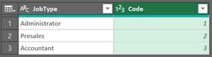This is the first table that includes the codes that I want to add to the second table based on two criteria (highest code value, matching Job Type:This is the second table where I want to add the highest codes wherever the Job Title matches: