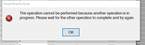 The error message you're encountering in PowerPivot for Excel indicates that there is another operation already running, and you need to wait for it to complete before performing the desired operation. This message typically occurs when PowerPivot is busy processing data or performing calculations.
