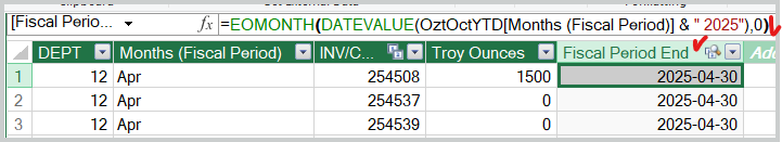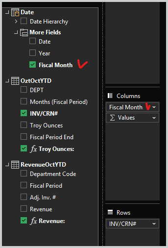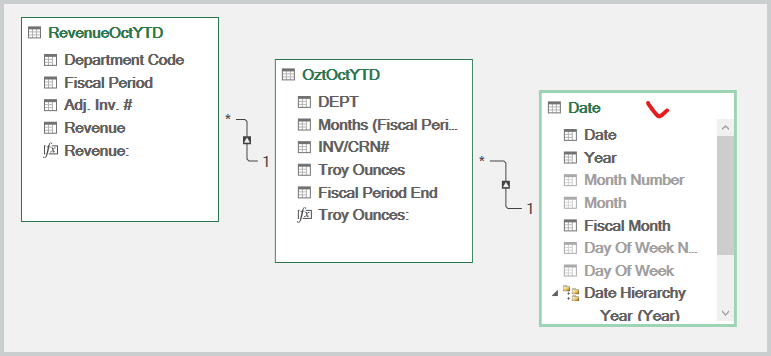 In the following link you will find a PowerPivot that is referencing 2 specific tables with Inv# being the common field between the 2 tables. The PowerPivot is bringing in Troy Ounces and Revenue by Invoice #, Fiscal Period and Department. Unfortunately the total Troy Ounce amount is being repeated under each Invoice #. It should be showing the respective troy ounce by what the invoice is recording.