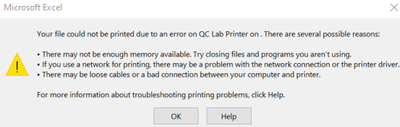 I have a colleague who sent me an Excel file that prompts an error each time I open it (Photo below). It does not allow me to even open the document until i select the printer which is connected to my colleagues computer. Once I select his printer, I can open the document and edit it. Is there a way to fix this error from popping up? It states there is an error with my printer "QC Lab Printer" but once I am inside the file I can switch to my printer and print from it.