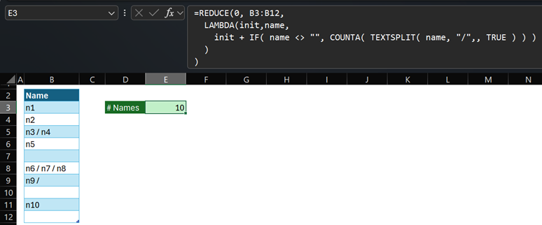 =REDUCE(0, TOCOL( B3:B12, 1), LAMBDA(init,name, init + COUNTA( TEXTSPLIT( name, "/",, TRUE ) ) ) )- m_tarlerBronze Contributor