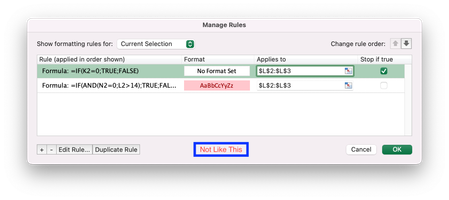 As I mentioned before that does not help. Excel won’t change the cell numbers automatically regarding to based cell number. As you can see on the screenshot of “Not like this”, K, N and L are still in contrast to “apply to” cell changes. So If I leave it like this, “apply to” cells always check conditions in the cells of K2, N2 and L2. I need these conditions to be adjust relatively according to “apply to” cells..