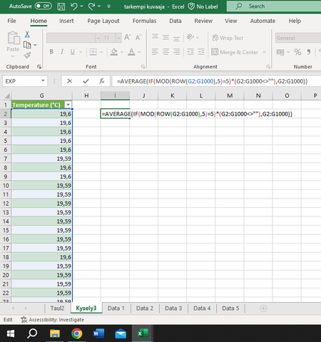 Hello! I have a very large table (over 45000 rows so manual calculation is not an option) and I want to calculate the averages for every 5 rows. My data starts at row 2 and the first row is title...