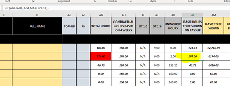 I am trying to write a formula for AL4. Basically what I want is that if AG4 is less than AH4 the number in AG4 will show in AL4, and if the number is higher then AH4 in AL4 will show 173.33 ...