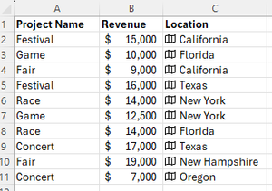 Project Revenue by geographic location, filtering out some projects by name (SUMIFS?)