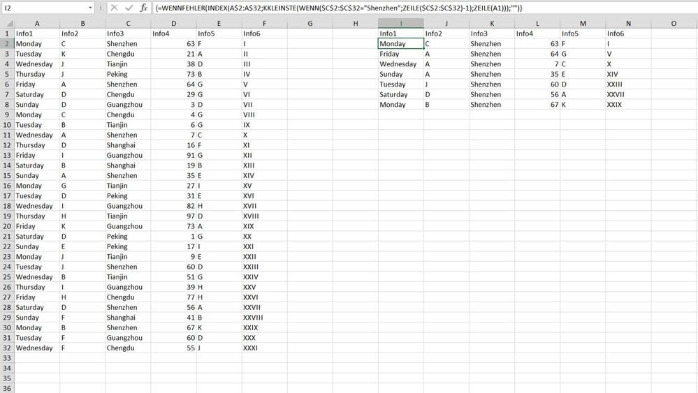 =IFERROR(INDEX(A$2:A$32,SMALL(IF($C$2:$C$32="Shenzhen",ROW($C$2:$C$32)-1),ROW(A1))),"")Is this similar to what you are looking for? The formula is in cell I2 and dragged across range I2:N10 and works in all versions of Excel. The formula must be entered as an arrayformula with ctrl+shift+enter if someone doesn't work with Office 365 or Excel for the web or Excel 2024. The formula works across two sheets as well. For illustration i've made an example within one sheet. With recent versions of Excel you can use the FILTER function to simplify the solution.