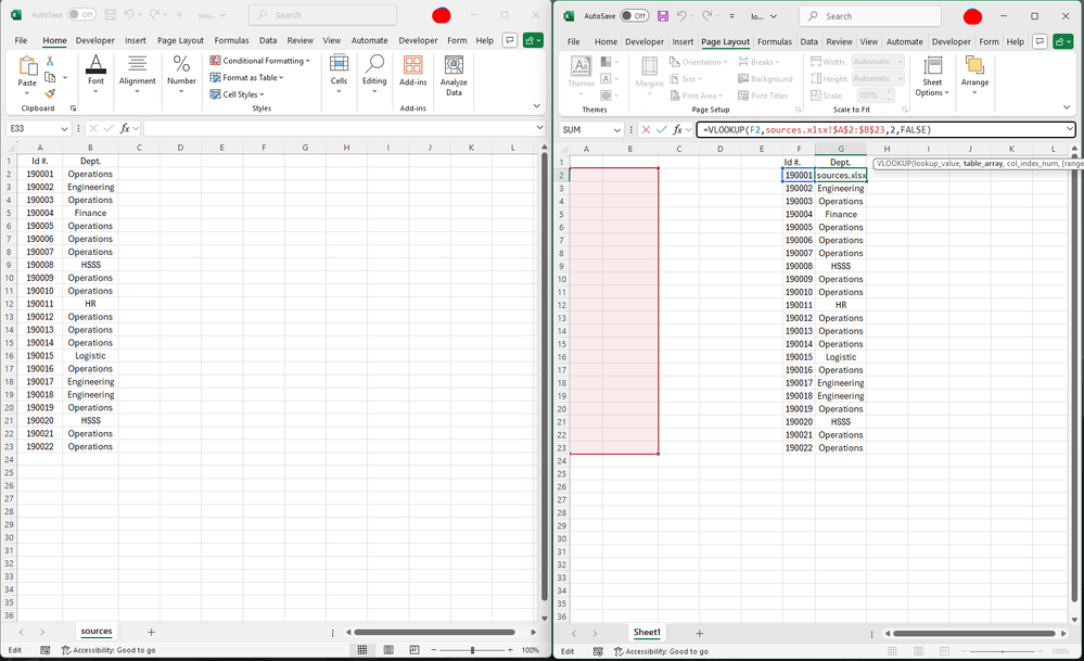 I’ve got a VLOOKUP pulling data from another excel file (sources.xlsx) the formula works as intended it's pulling the right department names based on id number, but here’s the weird part, when I double click the formula to check it, the table array ($A$2:$B$23) gets highlighted in the current sheet instead of the actual source sheet (which is in the other file).