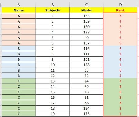 Hi I have data similar to what is in Colums A, B & C. My objective is to get data(Ranking) in column D as seen in the image. Can you guys please help me. Basically what i want to get is Ranking of ...