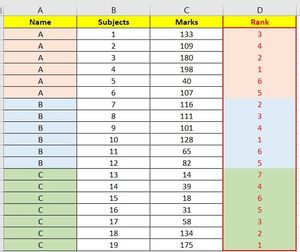 Hi I have data similar to what is in Colums A, B & C. My objective is to get data(Ranking) in column D as seen in the image. Can you guys please help me. Basically what i want to get is Ranking of ...