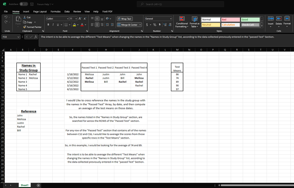 In the photo above, we would be looking for the average of 74 and 89, as those are the only two rows (in G12:J16) containing both “Rachel” and “Melissa” (the names found in C12:C16).
