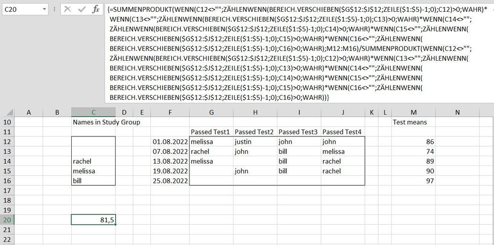 What is your expected result if there are 5 different names in the study group? The formula returns an error because 5 different names from the study group can never appear in 4 passed test cells for one day. With IFERROR you can return an individual message instead of an error message in this case.