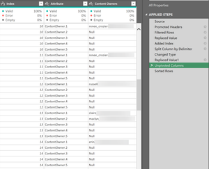 #"Changed Type" = Table.TransformColumnTypes(#"Split Column by Delimiter",{{"SiteCollection", type text}, {"Site", type text}, {"ContentId", Int64.Type}, {"ContentOwner.1", type text}, {"ContentOwner.2", type text}, {"ContentOwner.3", type text}, {"ContentOwner.4", type text}, {"ContentOwner.5", type text}, {"Title", type text}, {"Index", Int64.Type}}),
