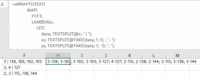 rachelSeems that in my Excel (version 2308, build 16731.20600), TEXTSPLIT with ARRAYTOTEXT not working. I tried to recreate your data (with "|") and the result seems like this: