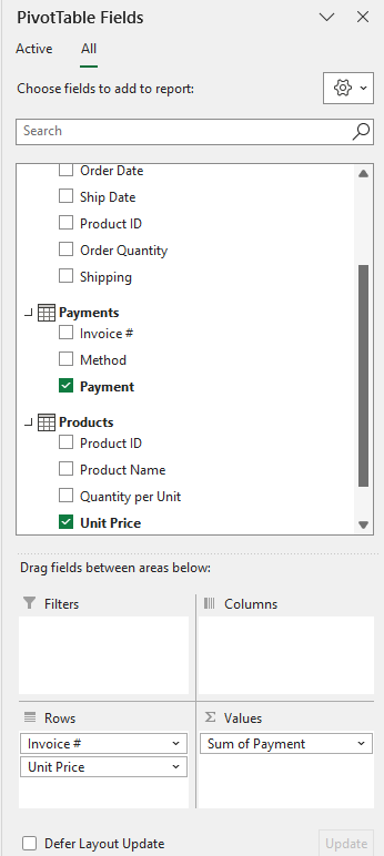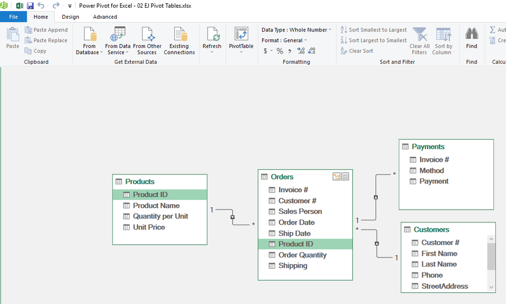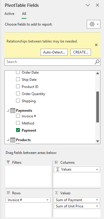I have four tables linked via three relationships. Any combination of fields from the Orders and Payments tables placed in the pivot table is fine. Placing any field from Customers or Products in values produces a relationship error. My original quest was to create a measure to multiply quantity from the Orders table by Unit Price from the Products table plus Shipping from the Orders table. In the process of experimenting to solve the problem, I discovered the same problem with the fields from the Customers table. I have CLEANed and TRIMmed the data. I even resorted to pasting all the data as values into a new workbook and starting over. Data types on the unique identifiers match. For the Product ID shown in the screenshots both are whole number.