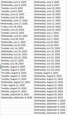 example: there would be one "Wednesday June 3, 2020" in each column above.