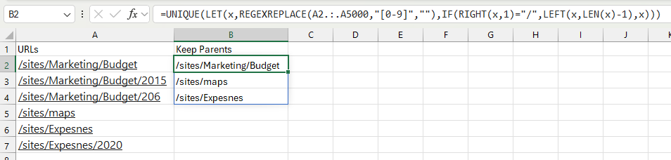 =UNIQUE(LET(x,REGEXREPLACE(A2.:.A5000,"[0-9]",""),IF(RIGHT(x,1)="/",LEFT(x,LEN(x)-1),x)))