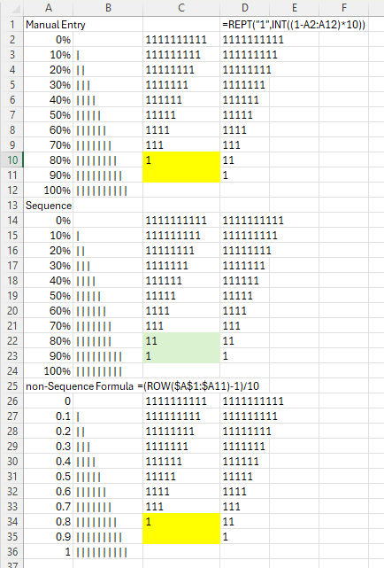 Intrestingly #1 - You can also use INT() of the value as shown in the image below, where I use =REPT("1",INT((1-A2:A12)*10)) and it works 'correctly