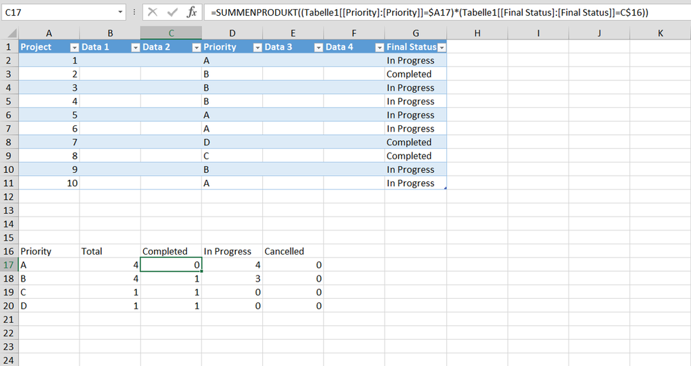 =SUMPRODUCT((Tabelle1[[Priority]:[Priority]]=$A17)*(Tabelle1[[Final Status]:[Final Status]]=C$16))