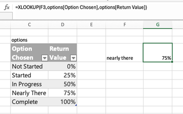 =XLOOKUP(F3,options[Option Chosen],options[Return Value])And then you can point the drop down list to the first column of the options table. Add or delete options later and the drop-down will automatically update.