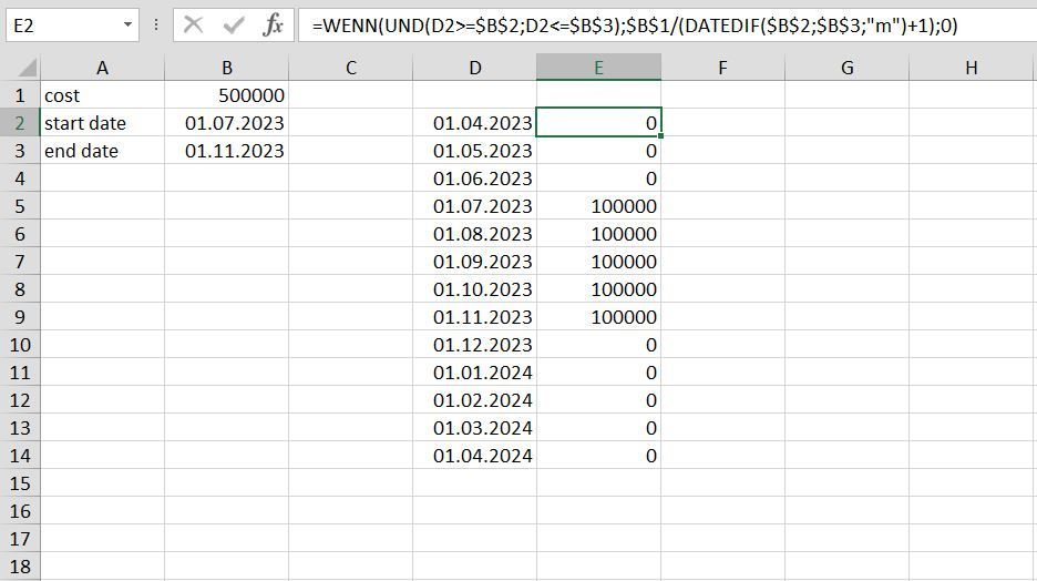 =IF(AND(D2>=$B$2,D2<=$B$3),$B$1/(DATEDIF($B$2,$B$3,"m")+1),0)This returns the expected result if i correctly understand what you want to do.