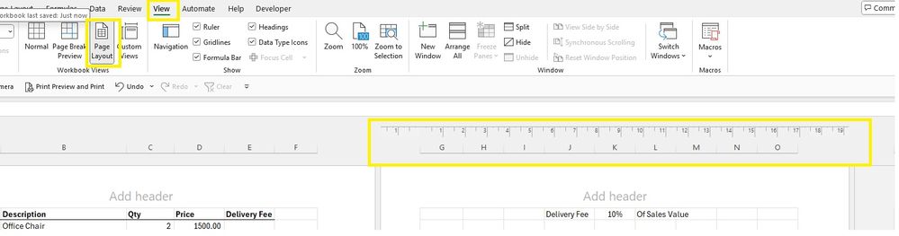 Excel doesnt have a built in ruler - normally people use the grid lines? What are you trying to achieve - perhaps there is a work-around to get a solution?