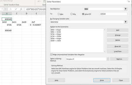 I have a 4 variable equation 24A+22B+20C+14D=300,123 so i set my equation =(24*B4)+(22*C4)+(20*D4)+(14*E4) as my set objective. I would like to get as close to 300,123 as i can, my objective is to be...