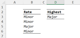 = LET( scale, {"Minor";"Moderate";"Major";"Extreme"}, TAKE(FILTER(scale, COUNTIFS(rate, scale)),-1) )sets up the scale and counts the number of occurrences for each level. Then filtering out levels that do not occur and returning the final value gives the desired result.