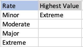 I need help creating a formula in Excel, as I have four values in the left column (Minor, Moderate, Major, Extreme) and on the right column, it should show in the cell of the highest value from the l...