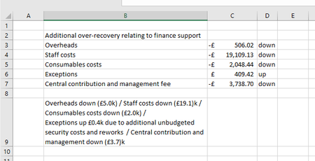 Dag470 I made a start in the attached example and suggest that you finish it yourself. Note that I used a helper column that generates the (£0.5k) type notation. You can do that in B9 as well but then the formula becomes much longer and more difficult to maintain.
