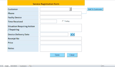 Products in technical service, customer name, phone, date, device name, device failure, repair fee, etc. information is entered into the textboxes on MAIN sheet, then when the button is pres...