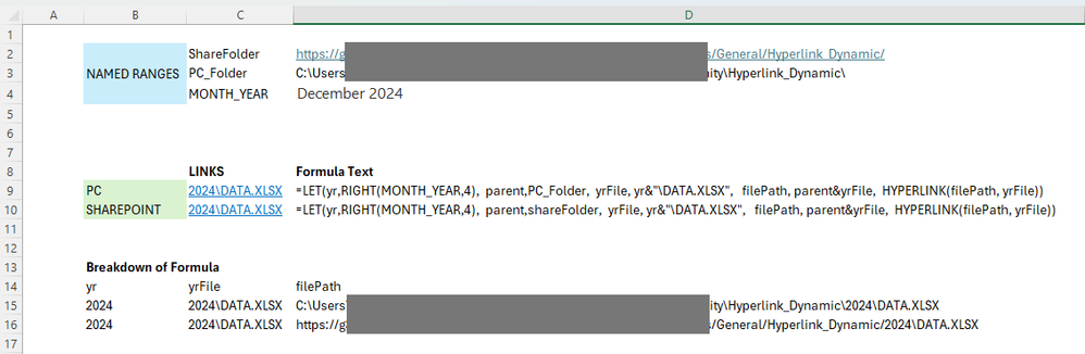 I broke it down into parts using a LET() statement and named ranges for the Root (parent) folders=LET(yr,RIGHT(MONTH_YEAR,4), parent,shareFolder, yrFile, yr&"\DATA.XLSX", filePath, parent&yrFile, HYPERLINK(filePath, yrFile) )This works for me, so it may be worth rebuilding the formula to make sure that the hyperlink is correct