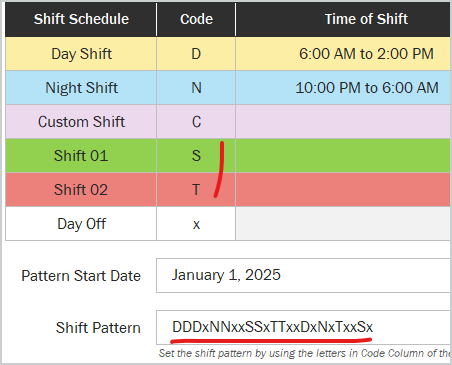 Next modify Shift Pattern string, i.e. in above: 3 days shift D, one day-off, 2 days shift N, two days off, two days shift S, etc.