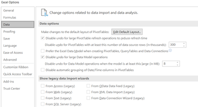 - acubed333Aug 02, 2019Copper ContributorHi Sergei, Am having same issue but looking into File->Options->Advanced->I don't see a Data section to be able to go to the "Prefer the Excel Data Model..." is disabled. Or creating Pivot Table disable "Add this data to the Data Model" in Pivot Table creation window