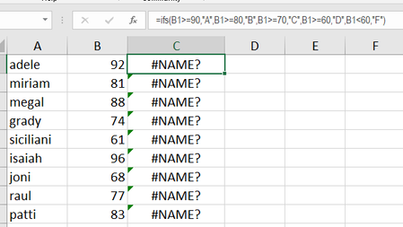 JoeUser2004Bronze ContributorJan 31, 2023SEANSKIM15 In lieu of IFS, try: =LOOKUP(B1, {0, 60, 70, 80, 90}, {"F", "D", "C", "B", "A"} )