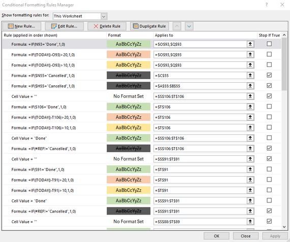 Is there a way to consolidate these or make more of a "batch" rule to cover whole columns? Here is what we are looking to accomplish with the conditional formatting: