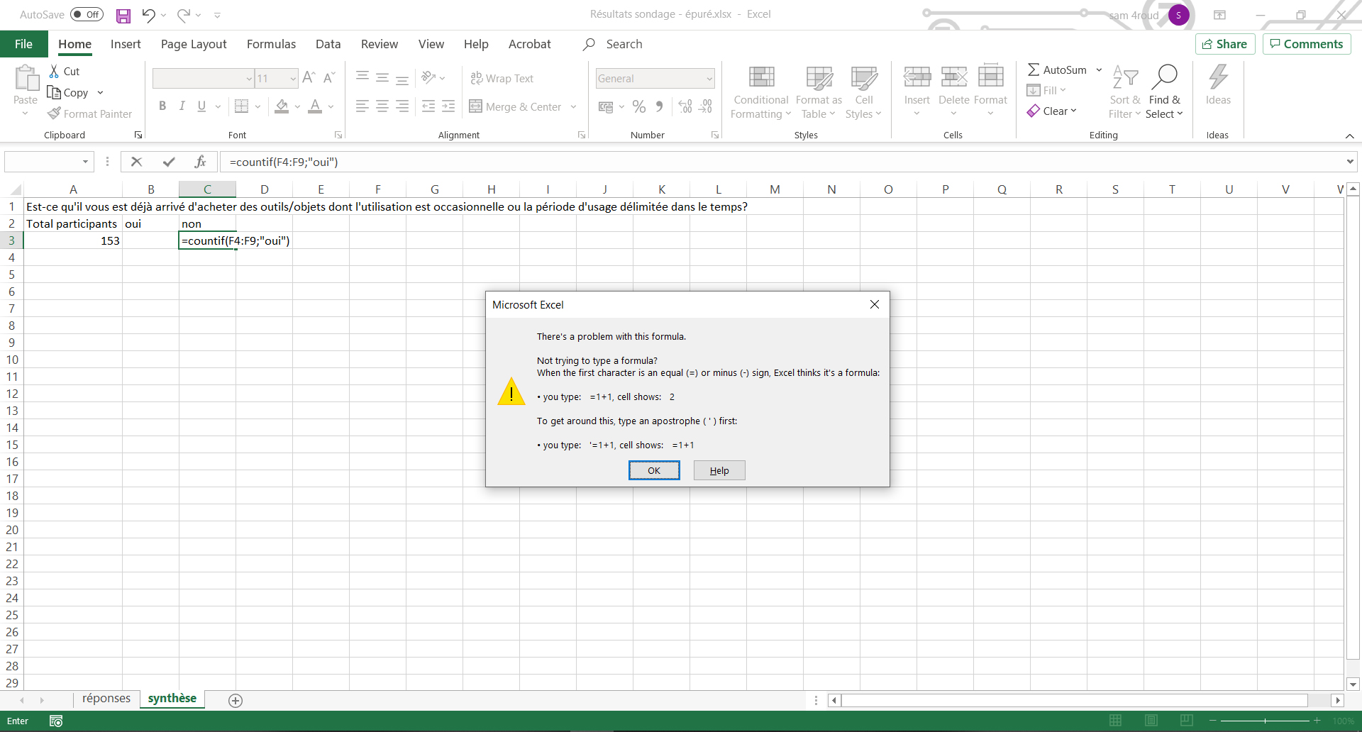 Excel is supposed to be logical, but I can't recognize it. My COUNTIF formula is exact and yet it refuses to compute it by sending me an error message (see attached picture). I tried several variants, to close and reopen the program, but nothing works. Any idea how to solve this problem?