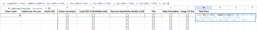 =sum((IF(G2=TRUE, =SUM(D2/1000*9),0))+(IF(H2=TRUE, 1, 0))+(IF(I2=TRUE, 1, 0))+(IF(J2=TRUE, 1, 0))+(IF(K2=TRUE, 1, 0))+(IF(L2=TRUE, 1, 0)) )