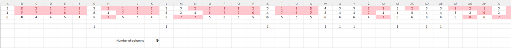 But I want only to count the columns that have no red mark. So in your exampel the count is 0. In my first picture the count is 2. In my picture below there are nine columns that are not marked in any of the three rows.
